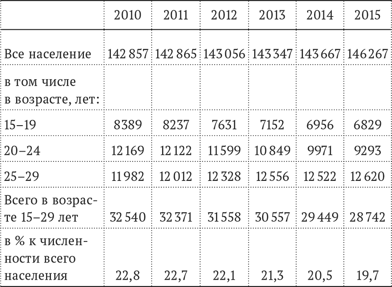 Таблица 1. Численность молодежи (15–29 лет) в Российской Федерации (тыс. чел.), 2010–2015 гг.