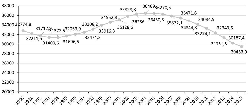 Рис. 1. Численность молодежи в возрасте 15–29 лет (тыс. чел.), 1990–2015 гг.