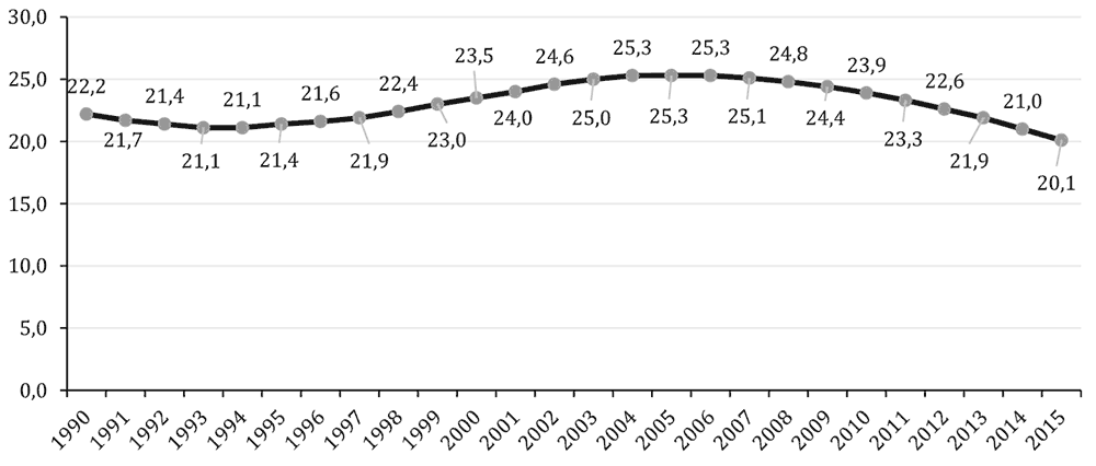 Доля молодежи в указанной возрастной группе в период с 1990 по 2015 г. по отношению к общей численности населения Российской Федерации менялась в интервале от 20,1 до 25,3 %. Наглядно характер изменения представлен на рис. 2.