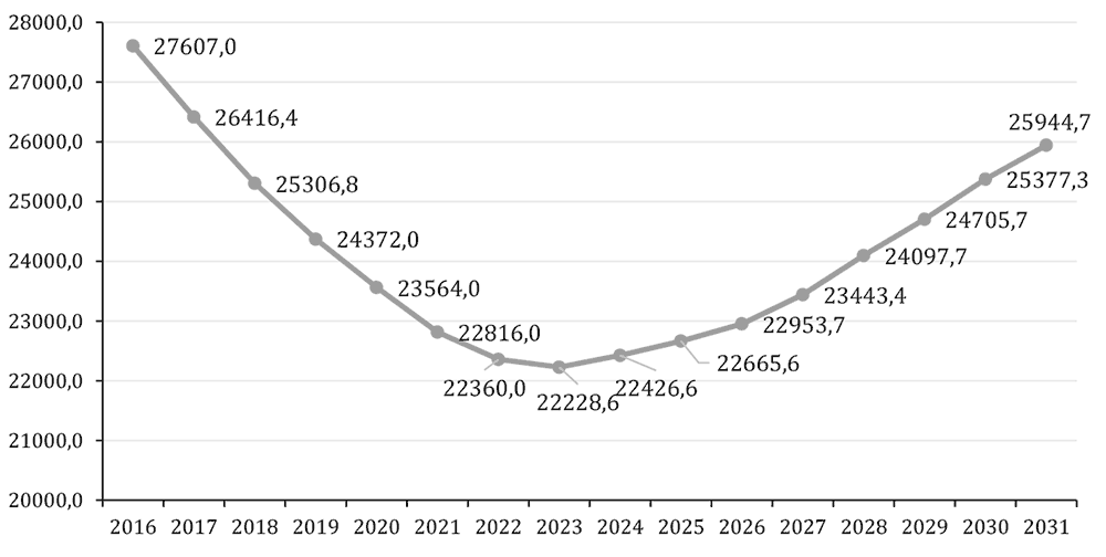 Рис. 3. Предположительная численность молодежи в возрасте 15–29 лет в Российской Федерации (тыс. чел.), 2016–2031 гг.