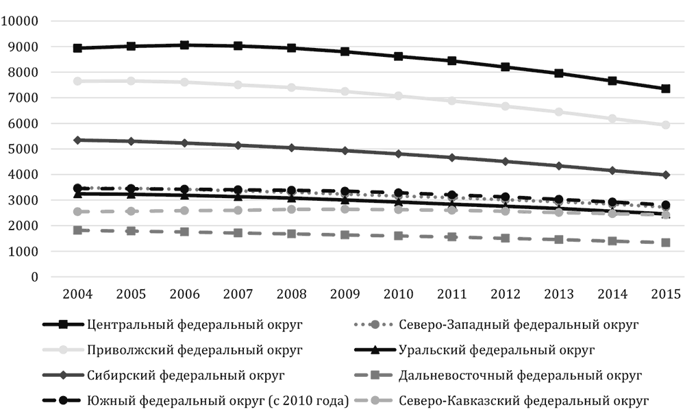Рис. 4. Численность молодежи в федеральных округах Российской Федерации (тыс. чел.), 2004–2015 гг.