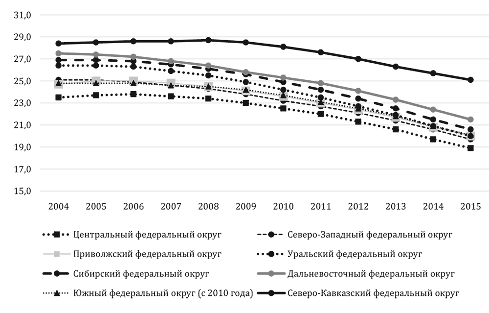 Рис. 5. Доля молодежи 15–29 лет в общей численности населения федеральных округов Российской Федерации (%), 2004–2015 гг.