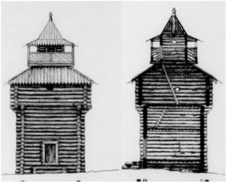 По углам стен высились четыре рубленные в три этажа башни высотой около 15 метров, в основании 4х4 сажени (8х8 метров). Первые этажи башен служили для размещения гарнизона и различного имущества, а в стенах верхних этажей прорезались бойницы – «затинные окошки» (с задвижками) для ведения огня по неприятелю. Причем делалось это с таким расчетом, чтобы огонь артиллерии и стрелкового оружия перекрывал не только впереди лежащее пространство, но и подступы к стенам и соседним башням. Основной сруб поднимался в высоту на сорок венцов из бревен толщиной 23–25 см, над ним нависал облам, состоящи й из пяти венцов. Внутри башен были устроены по два моста с лестницами, а наверху – шатер.