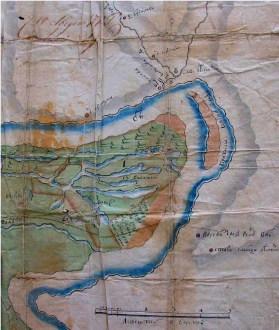 Белоярск. Карта 1775 года. Остров (Велижановка) на повороте р. Оби