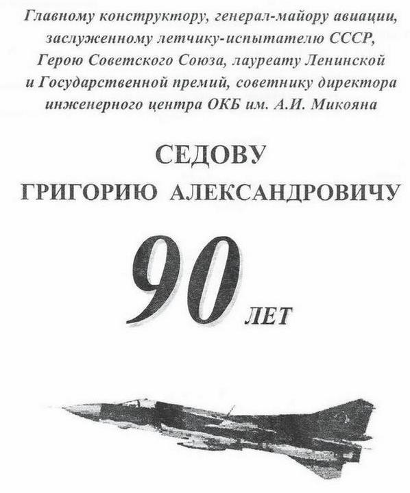 Коллектив Государственного научно-исследовательского испытательного института военной медицины Министерства обороны РФ и Научно-исследовательского испытательного центра авиационно-космической медицины и военной эргономики Института сердечно поздравляют Вас с замечательным юбилеем – 90-летием со дня рождения! Ваша жизнь – это беззаветное служение авиации. Получение высшего инженерного образования в стенах Военно-воздушной инженерной академии имени Н. Е. Жуковского и летного образования в военной школе летчиков-истребителей в Борисоглебске открыло Вам дверь в летную испытательскую работу и конструирование боевых авиационных комплексов. Навсегда связав свою судьбу с авиацией, Вы прошли славный путь от инженера-летчика-испытателя ГК НИИ ВВС до Главного конструктора прославленного ОКБ имени Артема Ивановича Микояна.