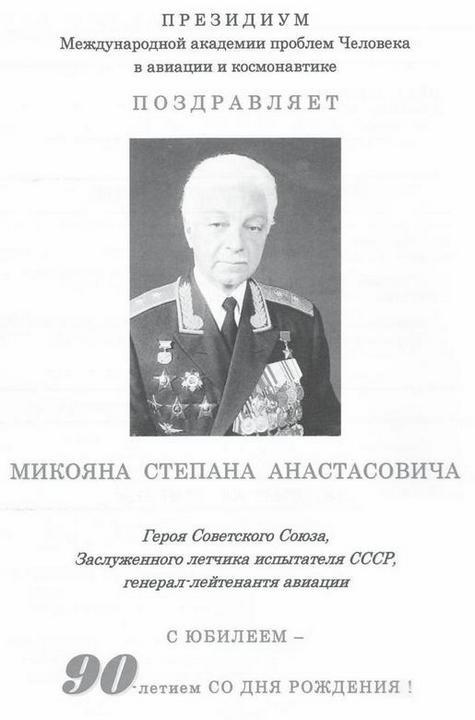 Поздравление Микояна Степана Анастасовича от Селиванова Виталия ПетровичаЧеловек планеты ЗемляНашему известному и заслуженному летчику-испытателю Герою Советского Союза Степану Анастасовичу Микояну 12 июля 2012 года исполняется 90 лет. Сама по себе дата своей редкостью впечатляет, но впечатляет и сам юбиляр. Пройдя ярчайший жизненный путь настоящего мужчины и воина, он по-прежнему занимает активную жизненную позицию, давая всем нам пример своего отношения к жизни, профессии, долгу перед Отечеством, требовательности к себе.