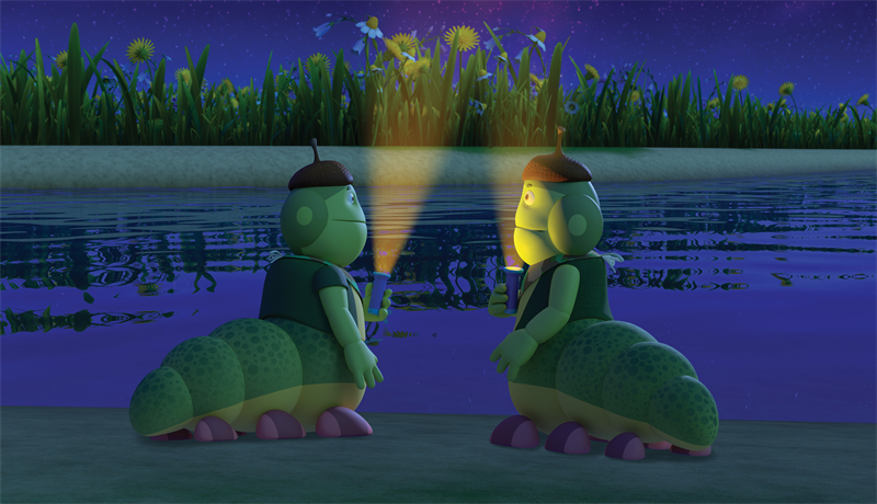 Друзья все вместе отправились гулять по полянке. Недалеко от пруда они заметили Вупсеня и Пупсеня. Гусеницы прятались за большим камнем, высматривая что-то в большую подзорную трубу. Услышав шаги друзей, они поспешили им навстречу.