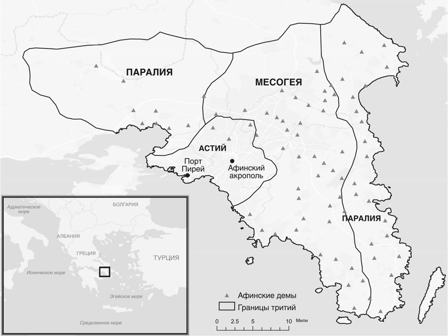 При этом государство Клисфена контролировалось более демократическими методами по сравнению с установлениями Солона. Клисфен понял, что ему следует еще больше ослабить клетку норм и отдалиться от племенных принципов в основании власти. Поэтому он пошел на смелый шаг и отменил четыре племенные «филы», из которых выбирался Совет четырехсот (буле) Солона, и заменил его на новый Совет пятисот, избираемых из десяти новых фил, названных по именам афинских героев. Каждая фила имела в буле 50 представителей. Филы делились на группы поменьше, называемые тритиями («третями»), а каждая трития в свою очередь делилась на региональные политические единицы – демы. Всего в Аттике имелось 139 демов (как показано на карте 2). Создание региональных административных единиц само по себе стало значительным шагом на пути строительства государства, потому что таким образом было почти полностью уничтожено существовавшее раньше деление по родовому принципу. Подводя итог итог реформам Клисфена, Аристотель отмечает, что тот
