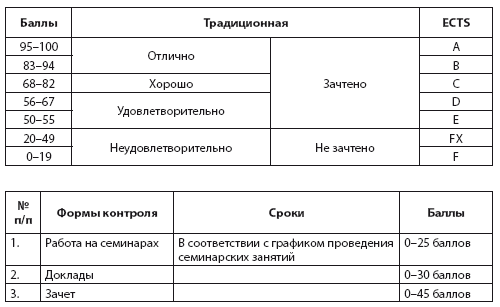 Система текущего и промежуточного контроля знаний студентов включает обсуждение докладов на семинарских занятиях, контрольные вопросы и зачет. Полученные баллы суммируются и распределяются следующим образом: