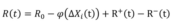 а символами (см. 13/1) обозначить величины восполнения и утечки ресурса соответственно, происшедшие за временной период, требующийся объекту для совершения смещения (или период наблюдения), а через R0 обозначить состояние ресурса в момент начала наблюдения, то в итоге можно записать выражение (25) для состояния ресурса по окончании смещения: