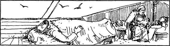 Сигрид чувствовала себя все так же плохо, как и в самом начале путешествия. На короткое время она выходила со своим ребенком подышать свежим воздухом на палубе, а потом снова забиралась под навес. Она рассчитывала на то, что высокие борта корабля и внимательность других людей на палубе не дадут упасть ее двухлетнему сыну в море. А мальчик тем временем играл с поросятами. И подчас маленький Эйнар даже брал себе поесть вяленую рыбу и мох из свиного корыта, и Сигрид говорила, что он вел себя точно так же и дома.