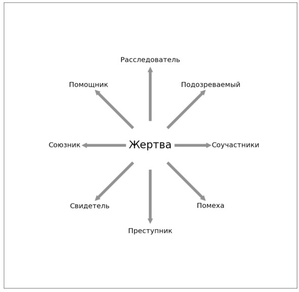 Жертва может становиться помехой в расследовании после своей смерти, если её прошлое или действия затрудняют раскрытие преступления, например, ведя следствие по ложному пути. Жертва -> Помеха.