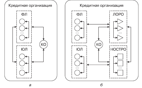 Представляется логичным денежные потоки между счетами ЮЛ, ФЛ одной кредитной организации рассматривать как потоки внутрибанковского перевода, поскольку в рамках таких переводов не затрагиваются корреспондентские отношения кредитных организаций или, иными словами, эти переводы осуществляются внутри одного банка (рис. 2.1а). Состав данных переводов включает и переводы, выполняемые между счетами ЮЛ, ФЛ, открытыми в разных филиалах кредитных организаций, через счета МФР.