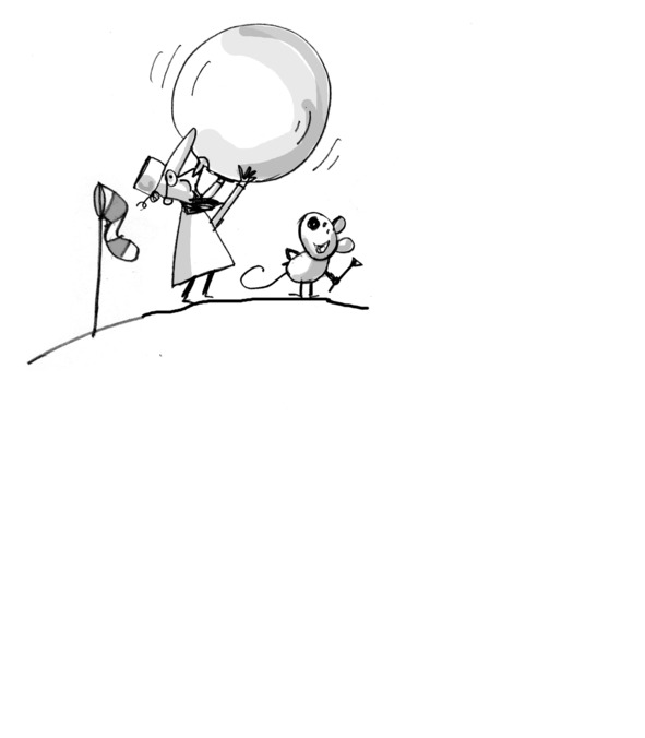 ПИНЯ подносит дудочку и с лёгкостью выдувает из нее пузыри (а ля реактивный двигатель). Проносится мимо, играя на дудочке в позе ангела. Этим он ужасно раздражает ПРОФЕССОРА. От злости ПРОФЕССОР попутно лопает лёгкие пузыри ПИНИ.