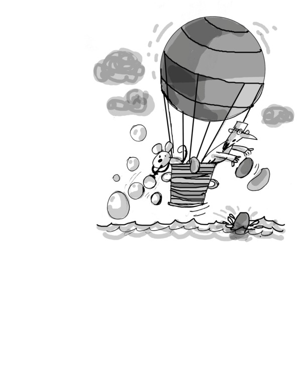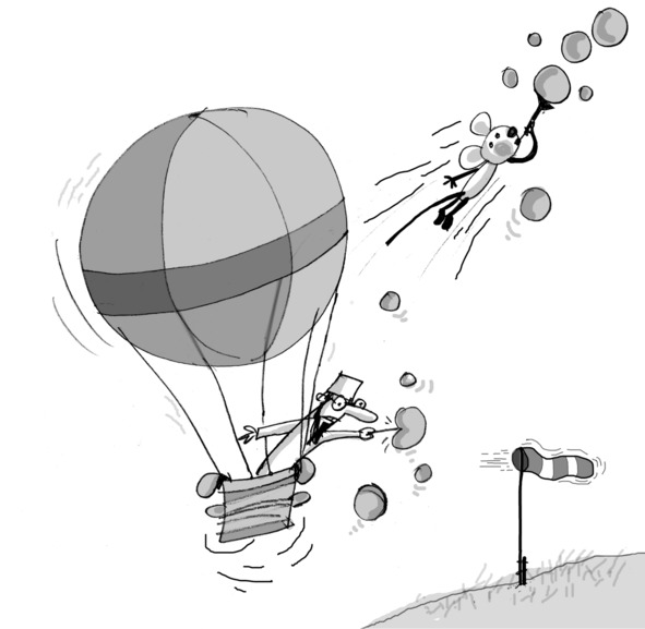 Несмотря на усилия ПРОФЕССОРА, аэростат снижается, вот-вот упадёт. Это передвижение если и можно назвать полётом, то разве что полётом камня вниз. ПРОФЕССОР начинает сбрасывать балласт.