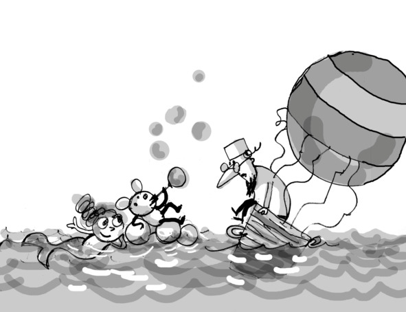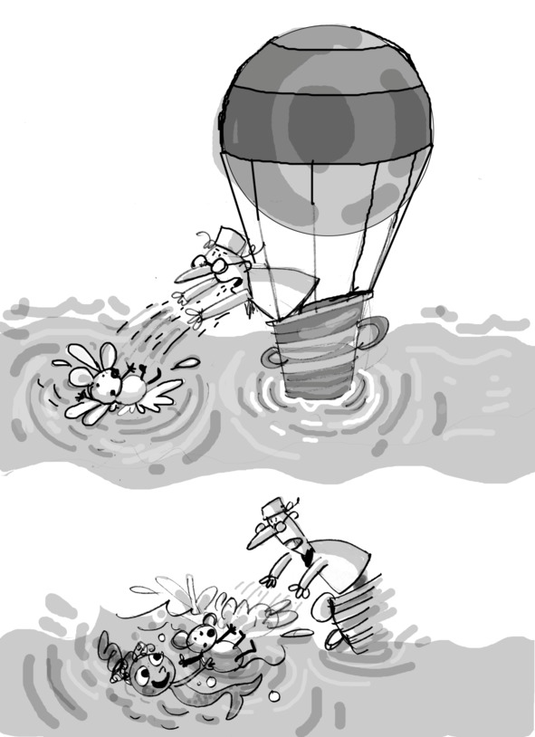 ПРОФЕССОР сердится, сбивает пузыри ПИНИ – никто не смеет мешать его полёту, даже если это падение, он хватает ПИНЮ, выбивает у него дудочку, с силой швыряет мышонка вниз, в воду.