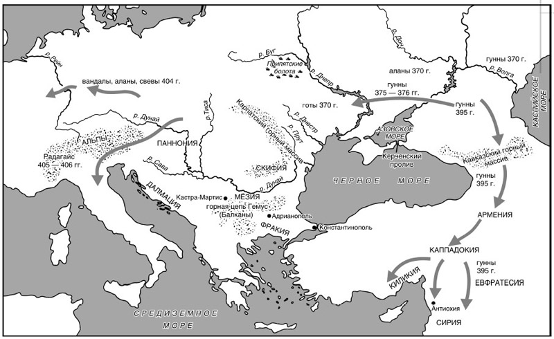 В этой книге нам придется довольствоваться, как это делали некоторые римляне, тем, что история гуннов начиналась не в Монголии, а у рек Кубань и Дон, и признаться, что нам ничего не известно о гуннах до конца IV столетия, когда они напали на остготов (остроготов). Наша история закончится крахом империи Аттилы. Правда, гунны еще сражались в армиях Юстиниана, но в VI веке они уже не играли особой роли и вскоре растворились в основном населении Европы, или их заменили другие так называемые гунны, которые постоянно двигались через степь на запад. Нам нечего сказать и об Этцеле.