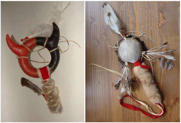 Очень часто, являясь инструментом шамана, погремушки несли на себе изображения, относящиеся к религиозным и мифологическим представлениям. Так, например, у племен северо-западного побережья деревянные погремушки, украшенные резьбой, представляли собой целое повествование. Большинство таких погремушек вырезались в форме одного из главных культурных героев этого региона – Ворона-Йеля. На животе Ворона обычно изображалось лицо мифологического персонажа, а на своей спине Ворон нес фигуру шамана и еще нескольких персонажей, имеющих отношение к конкретному повествованию, изображенному на погремушке.