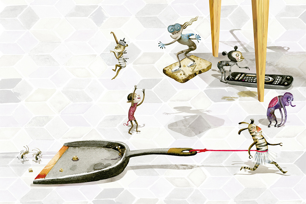 Больше всех ему нравится Масляный Сёрфер, который дни напролёт сидит в засаде на кухонном шкафчике. Вот кто действительно молодец! Он наблюдает, как люди делают бутерброды. Внимательно смотрит, как они намазывают масло на хлеб. А когда хлеб внезапно выпадает из рук и летит вниз, Масляный Сёрфер подбегает к краю шкафчика и запрыгивает прямо на падающий ломоть. Тут и начинается самое трудное: надо так балансировать телом, чтобы бутерброд упал маслом вниз. Выполнив задание, Масляный Сёрфер, довольный собой, исчезает за шкафчиком, а потом снова забирается наверх и ждёт следующего бутерброда.