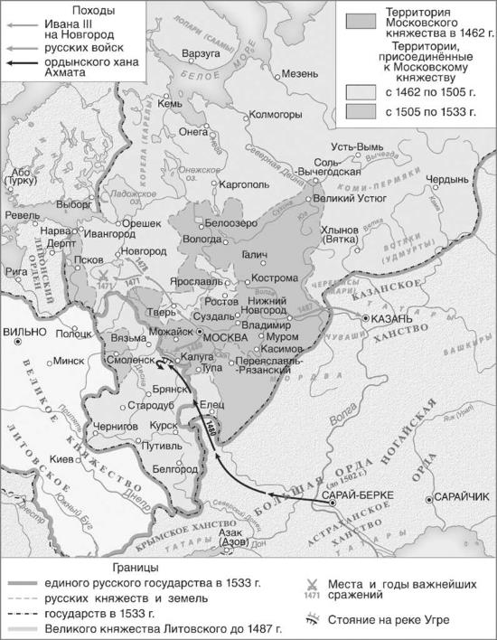 На протяжении почти четверти тысячелетия Русь добивалась освобождения от власти татарских ханов. Избавление от ордынского плена (польскими хронистами названного «игом») стало процессом долгим и мучительным. Свершилось оно трудами нескольких поколений московских князей, потомков Ивана Калиты. Самый успешный из них, Иван III, прозванный Державным, самостоятельно, без ханского соизволения, правил своей землей, став самодержцем и получив благодаря этому возможность формировать равноправные отношения с соседними странами. Он также вел активную деятельность по объединению русских княжеств, еще сохранявших некоторую самостоятельность. Собирание Руси, как правило, проходило вооруженным путем. Таким же образом – через военное, а потом договорное разрешение имевшихся спорных территориальных проблем – утверждались внешние границы страны. Почти одновременно Ивану III предстояло подчинить своей воле и привести к покорности Новгородское государство, Тверское княжество, Вятскую землю, выстоять в противоборстве с Большой Ордой и Казанским ханством, уладить пограничные споры со Швецией, Ливонской конфедерацией[4] и Великим княжеством Литовским, находившимся тогда в личной унии с Польским королевством. Все эти конфликты были успешно разрешены, хотя победы над многочисленными врагами дались Державному нелегко и потребовали значительных сил и времени.