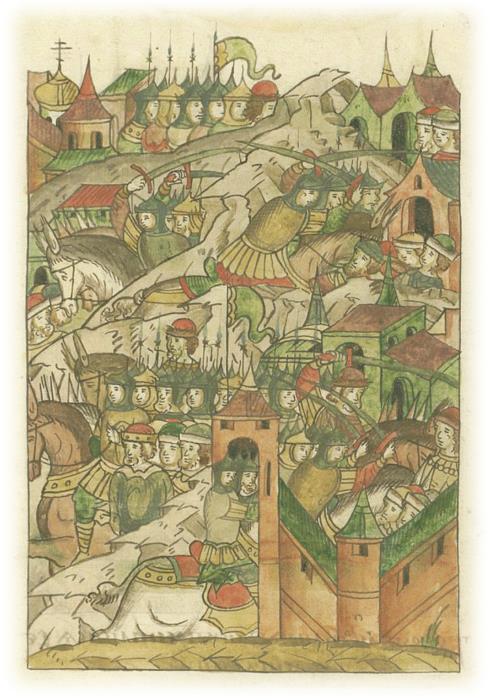 Рис. 5. Константин Дмитриевич с псковичами захватывает город Явизну. Миниатюра Лицевого летописного свода XVI в.