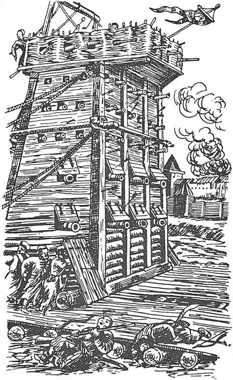 Стрельцы с высоты этого сооружения, придвинутого к стенам крепости, простреливали стены и улицы Казани, нанося защитникам города ощутимый урон. 31 августа «немчин» Розмысел[36] и его русские ученики, перенявшие у наставникау методы «градского разорения», начали вести подкопы под крепостные стены для установки пороховых мин. Первый подкоп был подведен ими под казанский водяной тайник. 4 сентября в галерею, сделанную под Дауровой башней Казанского Кремля, заложили 11 бочек с порохом. Взрыв не только уничтожил тайный ход к воде, но и серьезно повредил городские укрепления.[37]