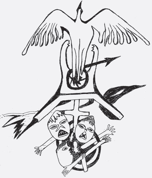 На рис. 7 в изобразительной форме представлены свободный дух, устремленный вовне, вверх (уместно вспомнить мандельштамовское «Божье имя, как большая птица, / Вылетело из моей груди, / Впереди густой туман клубится, / И пустая клетка позади»), и душа, в данном случае – больная, о чем свидетельствуют искаженные страданием лица (констатируем, без комментариев, что их тоже три). Для композиционной полноты (если иметь в виду трихотомию в ее завершенности) представляется желательным и даже необходимым образ тела.