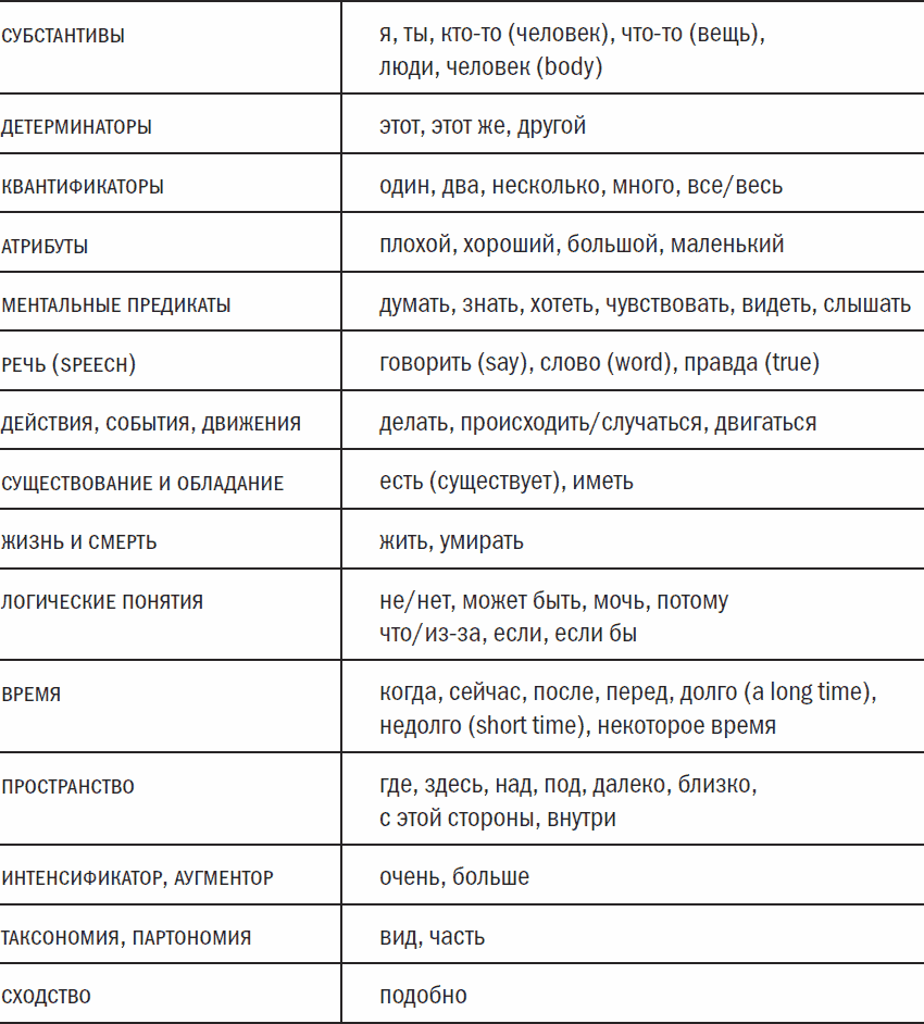 Таблица 1. «Естественный семантический метаязык» А. Вежбицкой