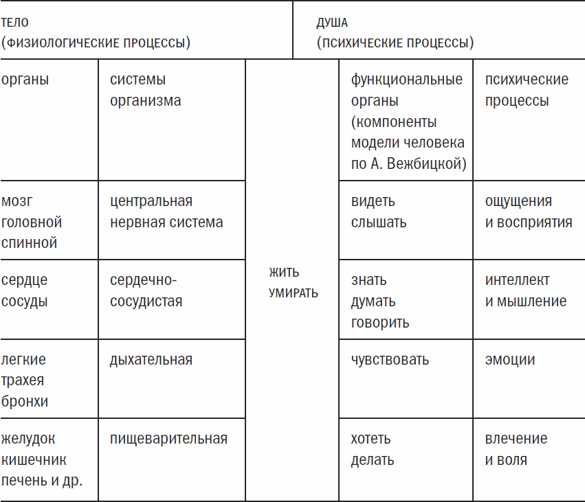 Компоненты языковой модели человека (левый столбик в колонке «душа») обозначены нами по аналогии с телесными органами и, пользуясь языком физиологии, как своеобразные функциональные (т. е. не имеющие наглядного материального субстрата) органы, обеспечивающие (точнее будет сказать – образующие) соответствующие психические процессы. Последние указаны в правой колонке таблицы.