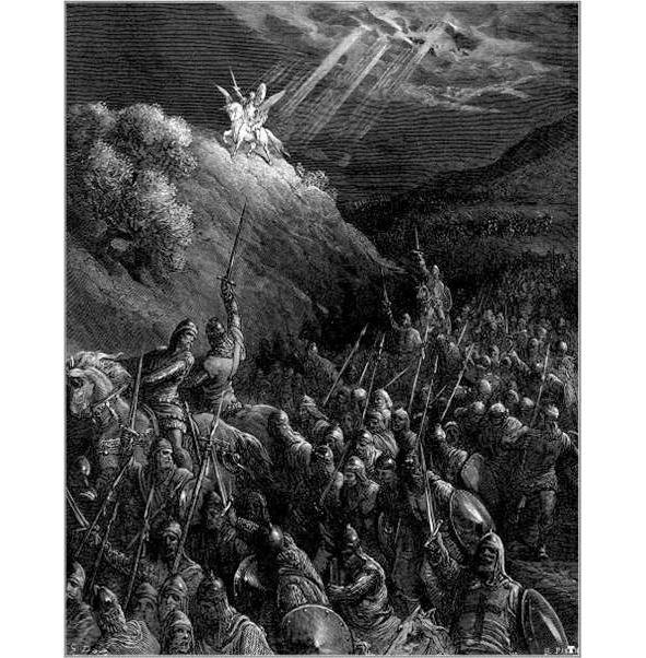 Архангел Михаил в «час Х» поведет в бой воинство Христа против Диавола. А на гравюре Г. Доре помогает крестоносцам под Антиохией