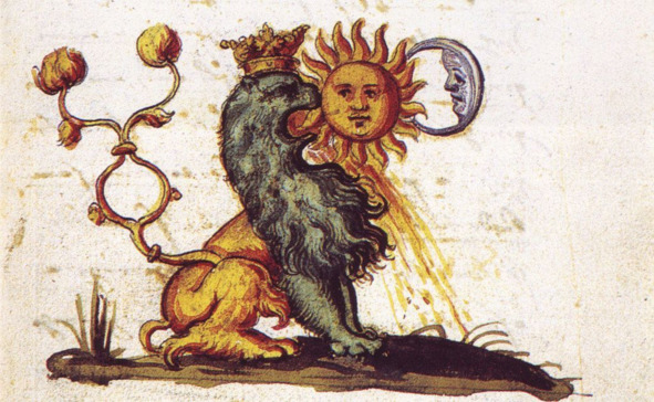 «Зеленый лев пожирает Солнце» (Алхимический символ из «Розария философов», 1578)