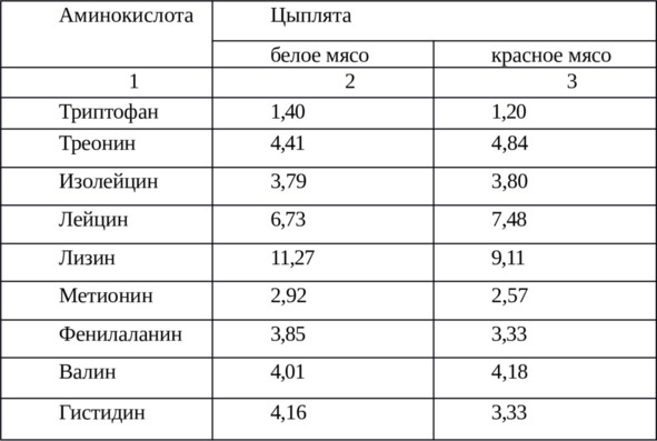 В таблице 1 по данным Иоцюс Г. П., Старчиков Н. И. (1979) приведен аминокислотный состав мяса птицы.