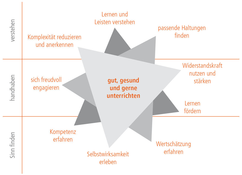 Zudem verstehen sie es, gerne bzw. mit gesundem Engagement zu arbeiten, mit den komplexen Anforderungen und Gegebenheiten ihres Berufs ressourcenorientiert umzugehen, passende Haltungen für unterschiedliche und auch schwierige Situationen zu finden sowie ihre Widerstandskraft gekonnt ins Spiel zu bringen und zu stärken. Solchermaßen engagiertes wie gesundes Wirken und Werken schafft die Ausgangslage für ein als sinnhaft erfahrenes Arbeiten, das von Anerkennung und Wertschätzung getragen wird (ausführliche Erläuterungen zum salutogenen Unterricht siehe Kapitel 7 Salutogener Unterricht – Gut, gesundheitsförderlich und gerne unterrichten).