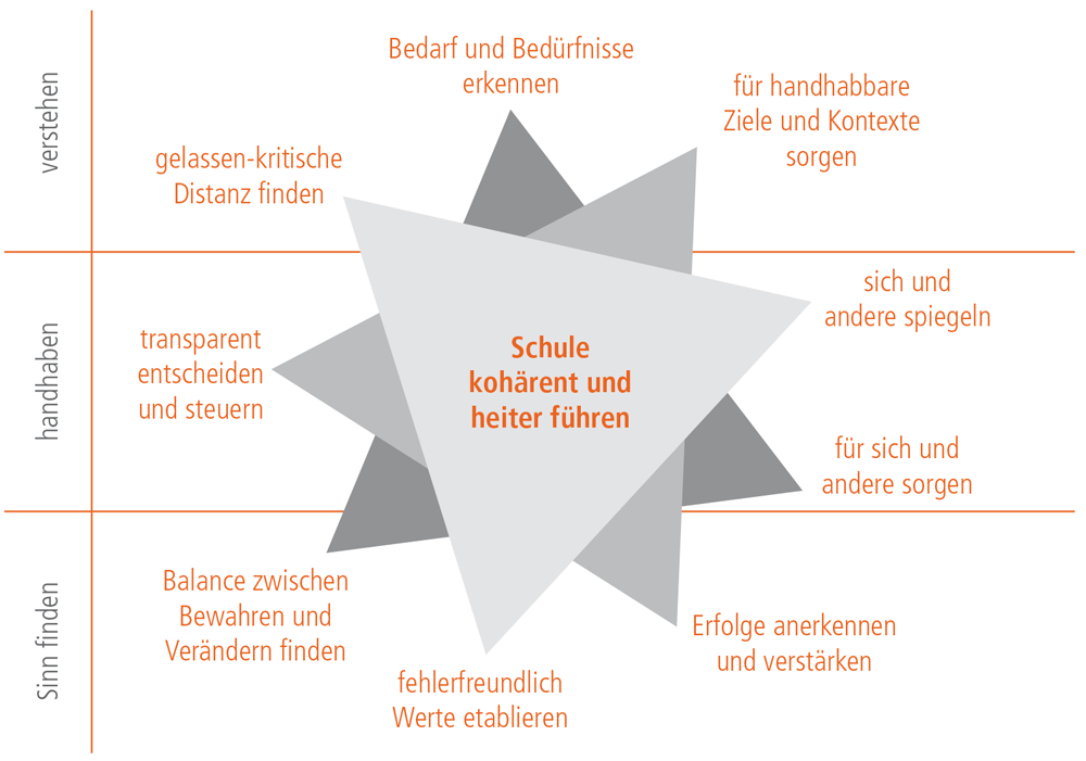 Weil das Handeln der Schulleitungen nachweislich direkt und indirekt Einfluss auf die gesundheitlich relevanten Bedingungen der Schule nimmt, wird Lehrergesundheit inzwischen als Führungsaufgabe verstanden (Harazd, Gieske & Rolff, 2009). Dabei stehen Schulleitungen als »soziale Innenarchitekten« (Rolff, 2013) vor der Herausforderung, für die Schule eine in sich stimmige und sinnstiftende Vision und Konzeption zu entwerfen und hierfür die passenden Strategien und Strukturen für wirkungsvolle Prozesse aufzubauen und zu pflegen, durch die Schulentwicklung in einem kollegial-unterstützenden und wertschätzenden Klima als »Sinn stiftend« verstanden und handhabbar wird. Und dies, obwohl von vielen Schulleitungen die Kontexte und Anforderungen von außen, denen sich Schule gesellschaftlich und politisch ausgesetzt sieht, als zunehmend inkohärent und zuweilen auch als widersprüchlich wahrgenommen werden. Dennoch gilt es, die in der Steuerung erlebten Widersprüche, Zielkonflikte und Dilemmata für alle anderen der Schulgemeinde möglichst gesundheitsförderlich und kohärent zu gestalten – und dies, ohne dabei selbst zu erkranken. Vor diesem Hintergrund schlagen wir als salutogenes Motto für Schulleitungen vor: »Schule kohärent und heiter führen«.