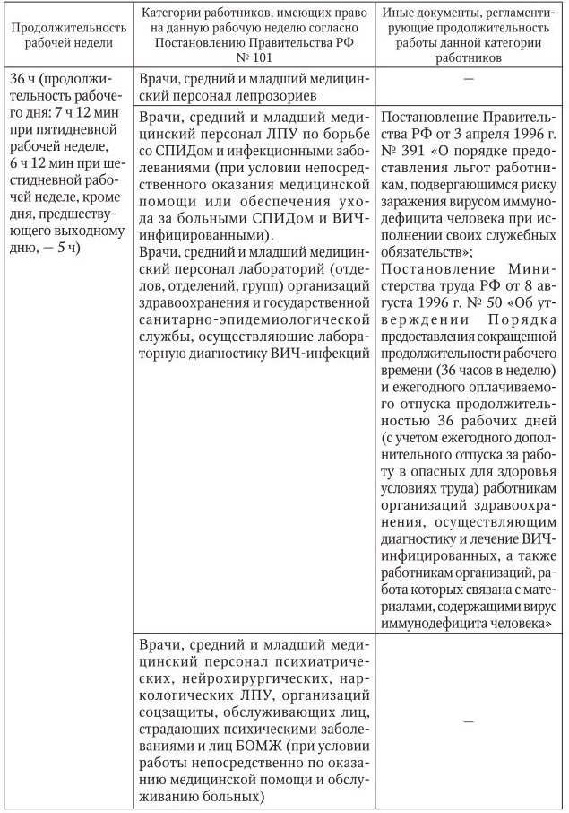 Исторически сложилось, что основанием для установления сокращенного рабочего времени для медицинского работника является не его специальность, а выполнение должностных обязанностей в определенных условиях. Нормы, регламентирующие порядок установления сокращенного рабочего времени медицинским работникам, изложены в Постановлении Правительства РФ от 14 февраля 2003 г. № 101 «О продолжительности рабочего времени медицинских работников в зависимости от занимаемой ими должности и (или) специальности». Кроме того, существуют и другие нормативные акты, посвященные данной проблеме.
