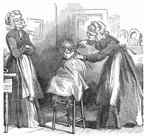 They thought I looked beautiful, only my hair was too long. Lame Betsey said she used to be the beater for cutting hair, and she tied her apron round my throat, and brought a great pair of shears out, that she used to go a-tailoring with. The Other Betsey, she kept watch to see when both sides looked even.