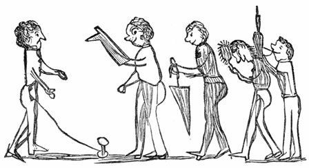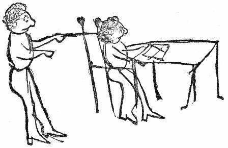 Benjie said, "Let's take something to hit it with!" And he took an umbrella and I took the bootjack, and Bubby Short took the towel horse, and Mr. Augustus took a hair-brush, and Dorry took his boot with his arm run down in it, and first we opened the door a crack and didn't go out, but peeped out, but didn't see anything there. Then we went out a little ways, and then we didn't see anything. And pretty soon, going along towards the stairs, Bubby Short stepped on something. "What's that?" says he. And he jumped, and we all flung our things at it. "Hold the light!" Dorry cried out.