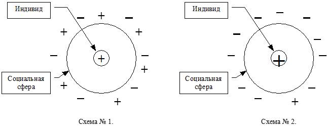 Однако случается, когда кто-то, напротив, сверх меры стремясь только к собственному позитивному состоянию, желая добиться большого плюса в основном для самого себя, своими действиями накапливает вокруг усиливающееся отрицательное поле. На схеме №2 такой индивид обозначен внутренним кружочком, но имеющим большой по размеру знак плюса. Здесь схематично изображено как желание одного индивида добиться исключительно собственного позитивного состояния за счет окружающих людей, в итоге, вызывает у последних рост негативных эмоций. И, в конце концов, социальная сфера, собрав высокий отрицательный заряд, будет стремиться изгнать эгоиста из общественного объединения. То есть, эгоцентричность вызывает со временем резкое увеличение числа недовольных поведением данного индивида. Если количество недовольных будет расти, и также возрастет степень их негативного отношения, то окружающие люди будут всячески стараться избавиться от источника раздражения, в данном случае эгоистичного человека.
