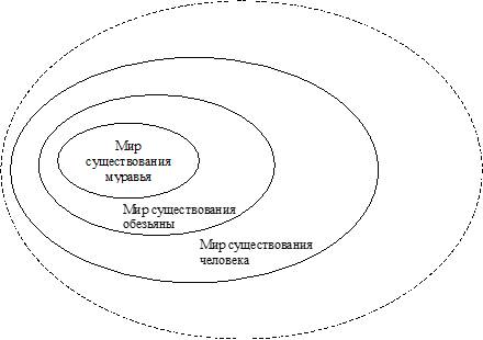 Рассмотрим все на примере. Возьмем для анализа мир существования муравья, обезьяны и человека. Условная схема, представленная на рисунке №8, показывает, что мир существования муравья меньше, чем у обезьяны. Это говорит о том, что многое из того, что доступно пониманию последней, выше пределов понимания первого. Аналогично, человеку легче понять мир муравья, но муравью никогда не понять человека. Фактически, человек может наблюдать за сферой существования муравья, оставаясь при этом вне пределов его ощущений. Первый может проникнуть во внутрь муравейника, будет изучать жизнедеятельность муравьев, но последнему никогда не понять, что есть города, государства, что кто-то летает в космос, строит ракеты. Также и обезьяна по отношению к человеку. И хотя она более восприимчива в сравнении с муравьем, все же ей не подняться до высот человеческого развития. Вряд ли она когда-нибудь будет думать о принципах мироздания, знать о существовании белков, ДНК, ядерном синтезе и т.д.