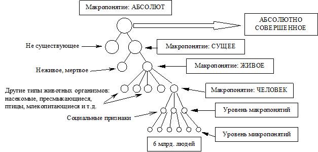 Рассуждения построены следующим образом. На Земле проживает в настоящем свыше 6 млрд. людей, каждый из которых уникален, имеет свои специфические признаки – имя, происхождение, внешний вид, внутренние знания, понятия и т.д. В тоже время все люди, отличаясь друг от друга, имеют схожие признаки, они носят название социальных. Например, кто-то является мужчиной, а кто-то женщиной. Получилось, что всех землян можно группировать на основе родовых характеристик, социальных признаков. Если всех людей разделить по полу, то получим две большие группы. Можно также выделять другие качества, например, национальные, возрастные, профессиональные, религиозные, расовые и т.д. Все вышеперечисленное является по отношению к уникальным, частным признакам каждого человека более общим, родовым, сущностным. По-другому, данные общие черты, родовые, социальные признаки называют макропонятиями. Макропонятие это родовой элемент, схожее качество, которым обладает множество данных явлений либо предметов, микропонятий. В целом, макропонятие является более глубинным по отношению к микропонятию. Но в последующем степень глубины может повышаться. Так получаются более сущностные категории. Например, в отношении всех проживающих на Земле людей наиболее сущностным макропонятием будет являться категория «ЧЕЛОВЕК». Все 6 млрд. землян обладают данным качеством. То есть, прежде чем мы будем говорить о ком-то, отмечая его качественные признаки, мы понимаем, что он, в первую очередь, «ЧЕЛОВЕК». Таким образом, последнее является родовым наиболее сущностным признаком для всех людей земли.