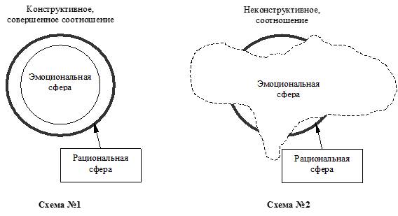 На схеме №1 показано соотношение, когда эмоциональная сфера находится внутри рациональной. Такая конструкция может оставаться устойчивой длительное время. Представим человека, который никогда не позволяет эмоциям превысить разумные понятия. Его поведение будет осмысленным, взвешенным, продуманным. Он сможет избежать многих ошибок, не давая волю сиюминутным желаниям. Напротив, тот, кто живет одним днем, у которого одно эмоциональное настроение быстро сменяется другим, и он не в силах подавить их, как правило, совершает много того, о чем приходится горько сожалеть. На рисунке №9 схематично представлено как эмоциональная сфера подавила рациональную (см. схему №2). Здесь характеризуется такое поведение, где мало разумного, но много эмоционального, импульсивного. Такое состояние разрушительно для личности. Оно может толкнуть на необдуманные поступки, о которых придется горько раскаиваться. Например, человек, будучи в состоянии большого гнева, совершил преступление, убийство. Такое поведение нельзя назвать совершенным.