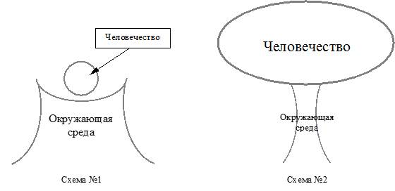 Если ранее, когда численность людей на планете была незначительной и потребляли они сравнительно немного, то окружающая среда оставалась стабильной и устойчивой (см. схему №1 на рис. №12). Она могла полностью обеспечить жизнедеятельность и человека и всех других организмов, обитающих на земле. По мере количественного роста населения баланс между человеческим обществом и окружающей его средой стал резко меняться. В настоящем, его условно можно представить в виде громадного колоса, находящегося на непрочной основе (см. схему №2 на рис. №12). Человечество количественно разрослось, но что самое губительное качественно гипертрофировались его потребности. Теперь каждый хочет не просто существовать, а потреблять по самому максимуму. Человека стало невозможным остановить чем-либо. В целом человеческое общество, учитывая его количество и, прежде всего, качественно возросшие потребности, стало невыносимой тяжестью для окружающей среды. Количественное и качественное возрастание людей становится громадным грузом, который иссушая и обескровливая среду собственного обитания, вот вот рухнет. Катастрофически сокращающаяся природная среда, перенапряженная от бездумного поведения людей, уже не в состоянии поддерживать баланс. Устойчивость системы снижается, скоро все опрокинется окончательно.