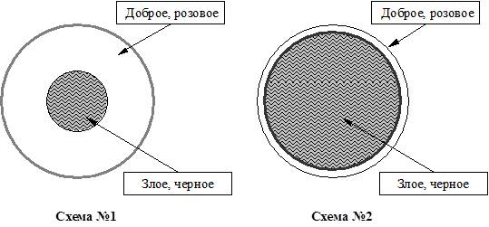 Злость есть у всех, любого можно довести до крайней степени негативного возбуждения. Однако, как правило, злое, черное, прячется под розовую оболочку доброжелательности. В нормальном состоянии человек обычно приветлив, общителен, дружелюбен, но это не означает, что его невозможно разозлить. Злое удерживается в глубине и выставляется только в случае крайней нужды. Схематично можно представить, что обыкновенно «злое, черное» имеет сравнительно небольшие размеры. Оно покрыто сверху толстой розовой оболочкой доброжелательности (см. схему №1 на рис. №14). Обычно человек встречая знакомого приветствует его, здоровается с ним, улыбается. Это всё исходит из розовой оболочки доброжелательности. Каждый знает, что поддержание социальных отношений в позитивном состоянии, есть залог его собственного позитивного положения. Поэтому никто напрасно ни с кем ссориться не хочет. Но бывает так, что человеку могут испортить настроение, нагрубить, обидеть его. У индивида сразу начинают возрастать негативные эмоции, злое и черное начинают увеличиваться. Если неприятное было кратковременным, то злость уходит, забывается, и по закону изменения относительного содержания, выталкивается другим эмоциональным переживанием. Но в повседневной реальности бывают случаи, что общение с обидчиком невозможно устранить. Такое случается, если обидчиком является коллега по работе, супруга или супруг, собственные дети, родственники, соседи и т.д., словом те, от которых нелегко избавиться. В данном случае нужно говорить, что появляется системный раздражитель, постоянный источник негативных эмоций. Регулярное испытывание злости приводит к тому, что соотношение объемов «доброго, розового» и «злого, черного» начинает меняться. Действие систематического источника негативных эмоций приводит к тому, что «злое, черное» начинает гипертрофированно расти. На рисунке №14 данное положение изображено на схеме №2. Часто сам индивид, уже после причинения ему обидчиком зла, наедине с самим собой, анализируя произошедшее, начинает культивировать злое. Его одолевают лютые фантазии, как он мог бы обойтись с обидчиком. Сознание снова и снова возвращается к анализу конфликта. Индивид хочет, чтобы в следующий раз при встрече с обидчиком, он смог как можно больнее поддеть последнего, задеть его самые легко ранимые стороны, чтобы суметь причинить как можно больше зла. Разум всё снова и снова прокручивает злорадные сцены, смакуя как можно было бы расправиться с обидчиком. Но незаметно для самого индивида культивируемое зло начинает отравлять собственную эмоциональную сферу. Злорадство, лютые фантазии отмщения, по сути, выращивают внутри самого человека демона. Сам индивид собственным сознанием внутри себя создает ад. Культивирование, смакование черного, стремление на зло ответить еще большим злом, приводят к резкому возрастанию их объема, и пропорциональному уменьшению розовой оболочки доброжелательности. Объем «злого, черного» увеличивается до таких пределов, что «розовое, доброе» с трудом, еле-еле удерживают состояние человека от психического срыва. Наличие системного раздражителя привело к тому, что розовая оболочка утончается настолько, что ее с трудом хватает прикрыть вырывающуюся наружу черную злость. Даже в случае снятия теперь системного раздражителя, эмоциональн