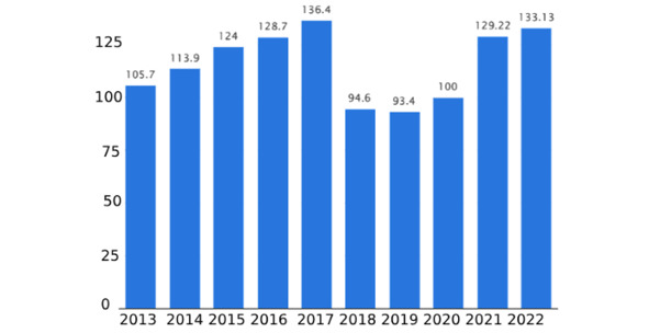 Figure 9. Annual turnover of the waste collection industry in Estonia from 2013 to 2022, million euros [36]