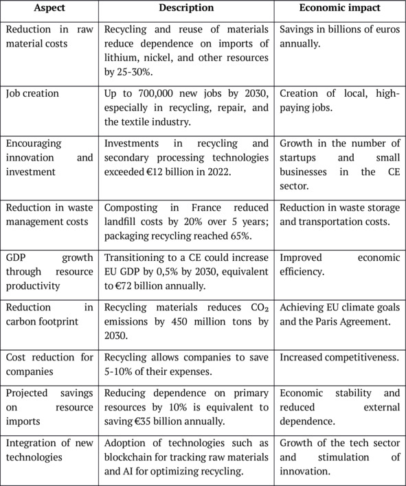 Transitioning to a CE generates major economic benefits in the EU. This transition impacts some of the main economic aspects: reducing the dependency on imported resources, creating new job opportunities, stimulating innovation, and reducing the waste and environmental pollution costs. All of these factors impact positively the economy of the region long-term and set up a sustainable basis for growth (table 1).