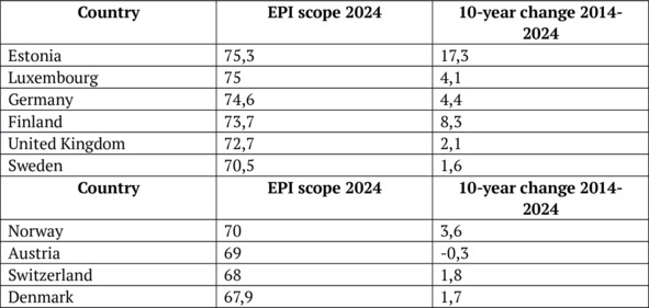 Estonia is one of the most progressive countries in Northern Europe regarding sustainable development and environmental care. Due to its advanced digital infrastructure, high level of citizen engagement in environmental issues, and innovations that are being actively supported, Estonia has succeeded in building a green economy. In the last years, the country is also actively developing a CE, what is reflected in its legislative and economic initiatives. In 2024, Estonia received the highest rating in the EPI and confirmed its leadership in environmental governance (table 2).