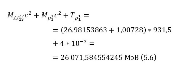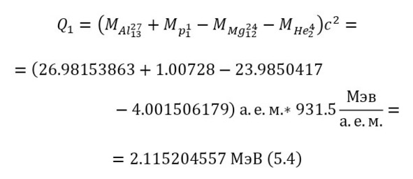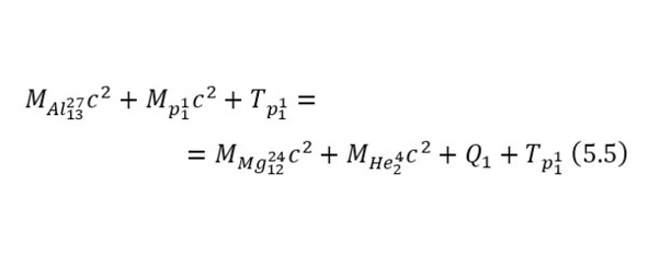 Протон с энергией в 4,457595117 МэВ и массой в 1,00728 а. е. м., налетает на алюминий-27 с атомной массой в 26,98153863 а. е. м., с выделением изотопа магния-24 с массой 23,9850417 а. е. м., а также альфа-частицы с массой 4,001506179 а. е. м.