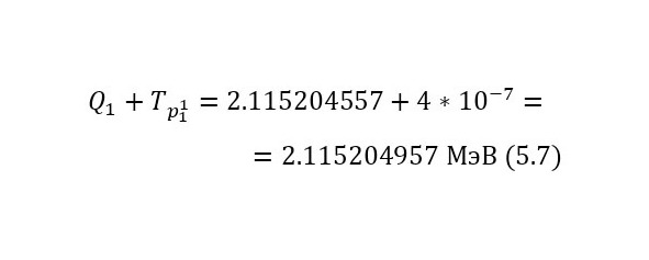 Из этих энергетических уравнений стало ясно, что кроме выхода реакции, добавляется и оставшаяся кинетическая энергия, благодаря чему общая энергия, распределяемая между частицами, составляет 2,115204957 МэВ из равенства (7). Теперь, для распределения этих энергий достаточно воспользоваться (8) и (9).