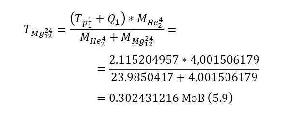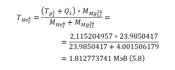 Поскольку эта реакция экзо-энергетическая, то нет смысла вычислять для неё порог реакции, остаётся лишь записать пару энергетических уравнений (5—6) и затем вычислить энергии, приобретаемые магнием-24 и альфа-частицей.