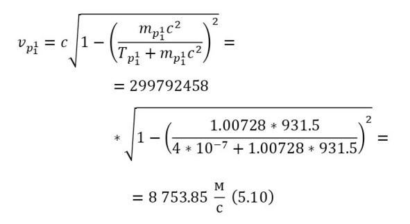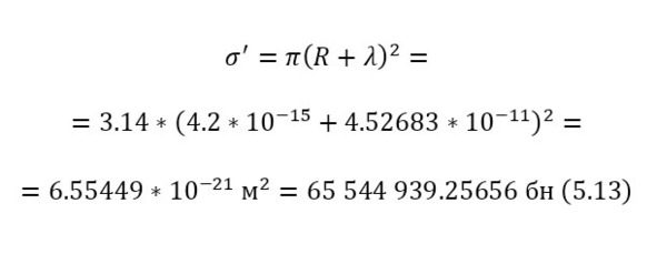 И наконец, остаётся определить сечение ядерной реакции и число взаимодействий. Изначально, необходимо вычислить длину волны налетающих протонов, для этого достаточно определить их импульс через (11), перед этим вычислив скорость в (10), а затем уже длину волны в (12).